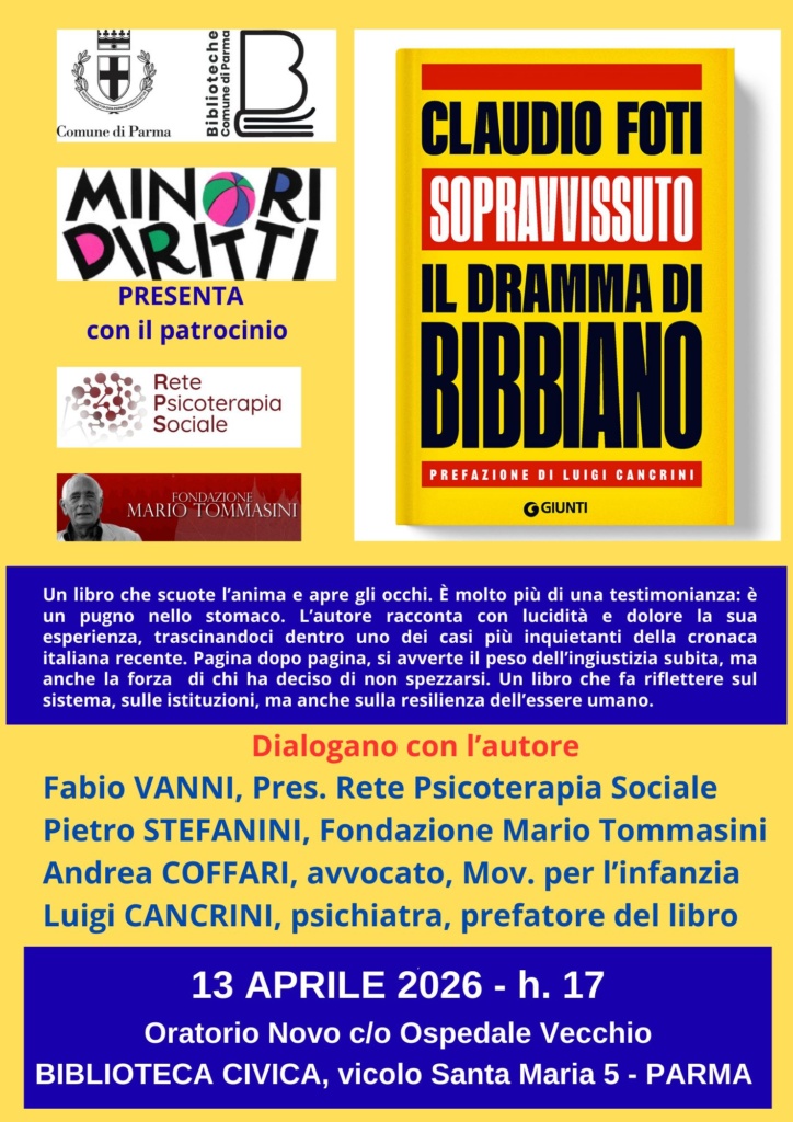 Lunedì 13 Aprile alle ore 17 presso l’Oratorio Novo (ospedale Vecchio) – BIBLIOTECA CIVICA, Vicolo Santa Maria 5. Dialogheranno con l’autore Fabio Vanni (Presidente della Rete Psicoterapia Sociale), Pietro Stefanini (Fondazione Mario Tommasini), Andrea Coffari ( Avvocato, Movimento per l’Infanzia) e Luigi Cancrini (Psichiatra, prefatore del libro).